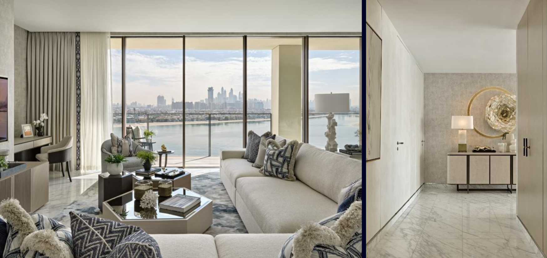 Conceived as a refined sanctuary above the city, the Atlantis The Royal Residences apartment balances contemporary elegance with timeless comfort. The design responds sensitively to the building’s dramatic architecture and panoramic views, using calm spatial planning and layered materiality to create a home that feels both sophisticated and deeply personal. Key elements include bespoke joinery and custom-designed furniture, richly textured wall finishes, and a carefully considered lighting scheme that transitions seamlessly from day to evening. Sculptural and statement lighting was a central design focus throughout the apartment, most notably demonstrated by the striking hand-blown chandelier suspended above the dining table. Designed to function as both a focal artwork and an atmospheric light source, the chandelier anchors the dining space, introducing a sense of occasion and colour while echoing the blue hues of the waves within the surrounding environment. Softly sculptural forms, natural tones and tactile materials were layered throughout to ground the interior and enhance a sense of quiet luxury.