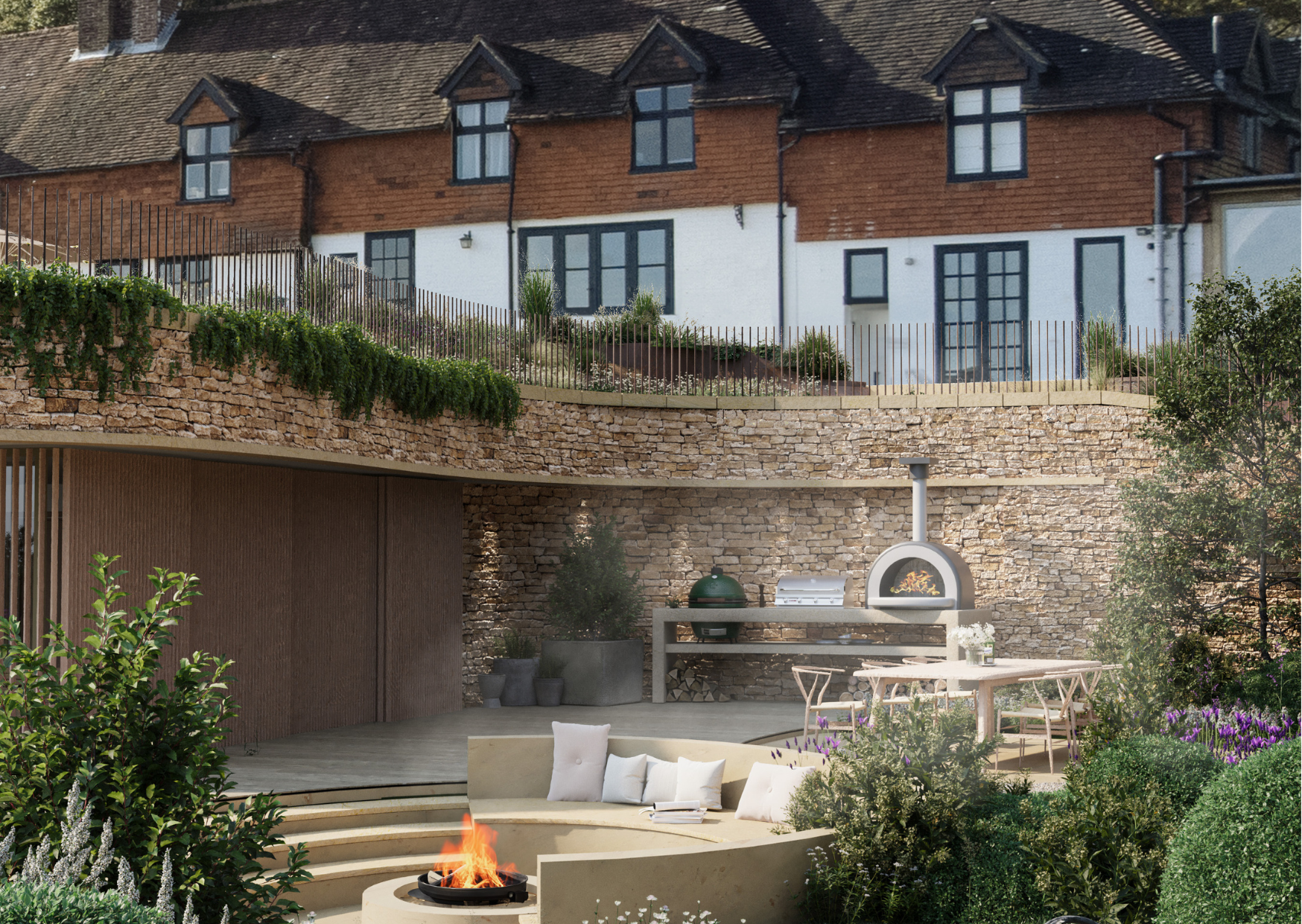 Terraces, vibrant planting, and carefully considered spatial relationships connect structures seamlessly to their surroundings. The pavilion, complete with a wood burner and timber dining table, supports year-round outdoor living while remaining sympathetic to the heritage architecture and sensitive listed status.