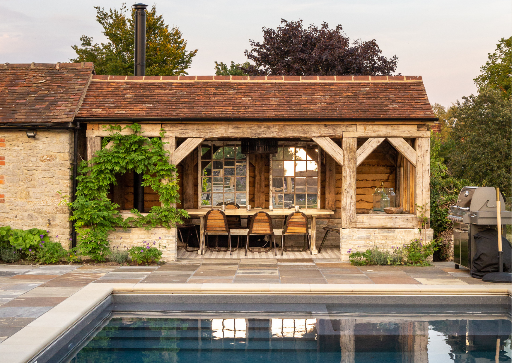 Landscape design can extend the usability and enjoyment of a home, strengthening the planning rationale. At Asher House, a luxury outdoor pool, sunken spa, and oak-framed pavilion were positioned to complement long-reaching views across sunlit fields.